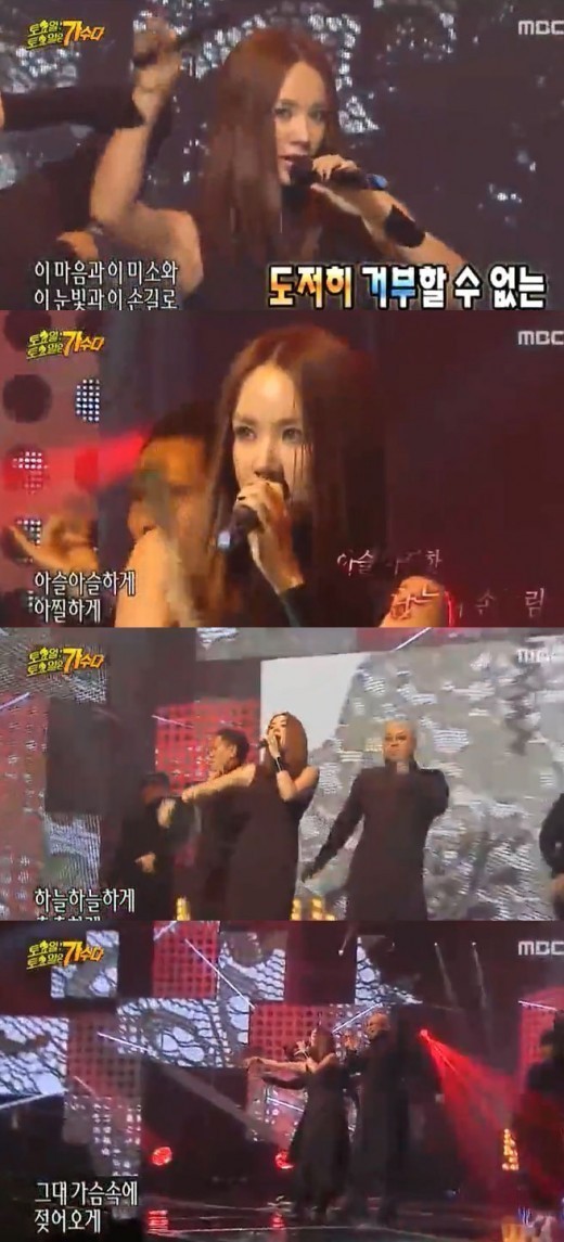 지난 3일 방송된 MBC '무한도전-토요일 토요일은 가수다(이하 토토가)'에서 엄정화는 원조 힙합전사 지누션의 '말해줘' 무대에 이어 그녀의 히트곡인 ‘초대’ '포이즌'무대를 꾸미며 시선을 사로잡았다.