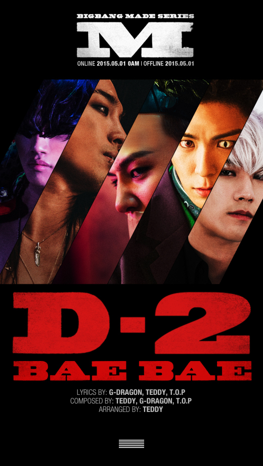 이와 함께 강렬한 빨간색으로 ‘D-2/BAE BAE’라고 쓰인 글씨 아래 ‘LYRICS BY: G-DRAGON, TEDDY, T.O.P, COMPOSED BY: TEDDY, G-DRAGON, T.O.P, ARRANGED BY: TEDDY’라고 표기, 이번 곡이 지드래곤과 테디, 탑의 합동 작품임을 알리고 있다.