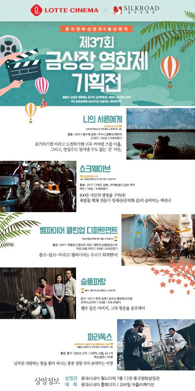 롯데시네마는 오는 30일까지 월드타워 중국영화상영관에서 '금상장 영화제 기획전'이라는 테마로 총 다섯 편의 중화권영화를 상영한다.