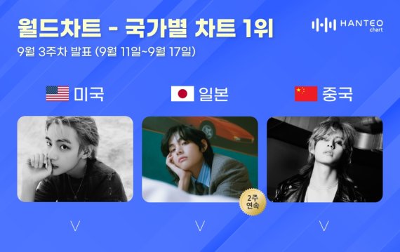 이번 주 국가별 차트 집계 기간은 지난 11일부터 17일로, 한터차트가 발표한 국가별 차트에서 이번 주에는 뷔가 미·일·중 모두 1위를 거머쥐었다.
