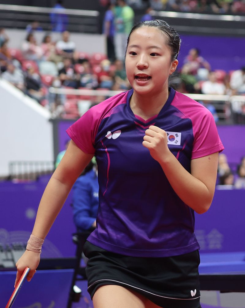 한국은 신유빈(대한항공), 전지희(미래에셋증권), 서효원(한국마사회)이 차례로 출격했다. 여자 탁구 대표팀은 이날 오전에 열린 파키스탄과 1차전에서 3대 0으로 승리한 뒤 태국까지 완파하며 조 1위로 8강에 직행했다. 이로써 8강에서 중국 혹은 일본을 만나지 않는 대진을 받게 됐다.