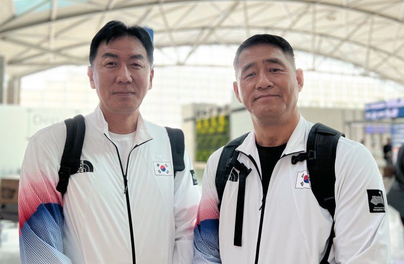 2022 항저우 아시안게임에 출전하는 남자 농구 대표팀 추일승 감독(오른쪽)과 이훈재 코치가 23일 인천국제공항을 통해 항저우로 출국 전 기념 촬영을 하고 있다. 뉴스1화상