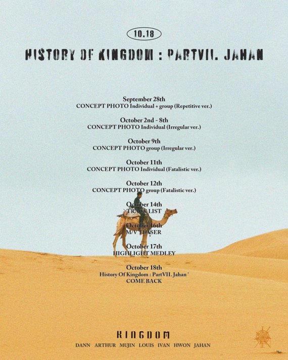 이후 킹덤은 10월 14일 신보를 살짝 엿볼 수 있는 트랙리스트로 컴백 분위기를 뜨겁게 데울 예정이다. 또 10월 16일 뮤직비디오 티저, 17일 하이라이트 메들리가 기다리고 있어 신보에 대한 기대감을 더한다.