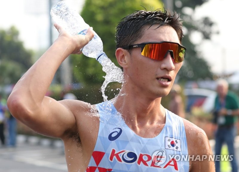 지난 2018년 8월 29일(현지시간) 인도네시아 자카르타에서 열린 2018 자카르타-팔렘방 아시안게임 남자 경보 20km에 출전한 최병광이 경기 도중 더위를 식히고 있다. / 사진=연합뉴스