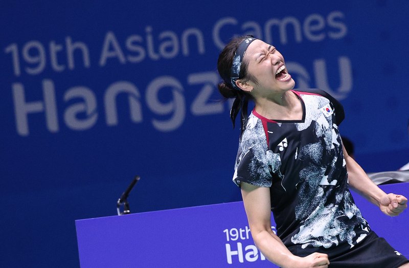 천위페이 잡은 안세영 (항저우=연합뉴스) 신현우 기자 = 1일 중국 저장성 항저우 빈장체육관에서 열린 항저우 아시안게임 배드민턴 여자 단체 결승에서 한국 안세영이 중국 천위페이를 상대로 승리한 뒤 기뻐하고 있다. 2023.10.1 nowwego@yna.co.kr (끝)