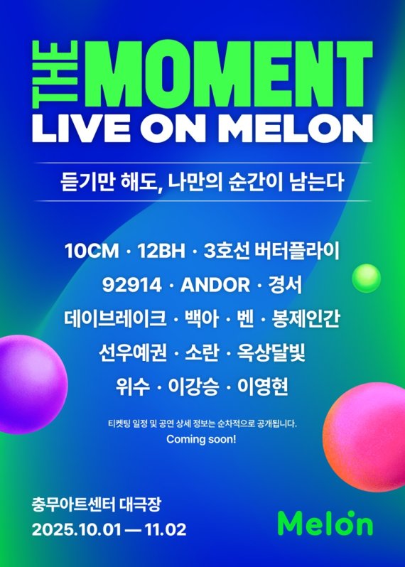 여기에 유료회원들을 위한 혜택까지 강화하는 차원으로 이번 'The Moment : Live on Melon'을 진행한다. 'The Moment : Live on Melon'은 '음악·공간·순간 on Melon - 듣기만 해도, 나만의 순간이 남는다'라는 메시지를 담고 있다. 대표 뮤직플랫폼 멜론이 성대하게 준비한 아티스트 단독공연 및 팬밋업이 서울 중구에 자리한 충무아트센터 대극장(1,200석 규모)에서 10월 1일부터 11월초까지 연속해서 펼쳐진다. 팬과 아티스트가 직접 마주하고 소통하며, 그동안 멜론에서 쌓아온 음악적 서사가 오프라인 공간에서 현실이 되는 강렬한 경험을 만끽할 수 있을 전망이다.