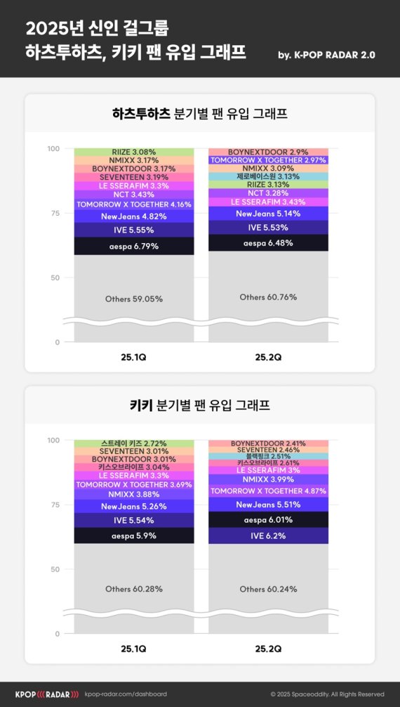 지난 2월 SM엔터테인먼트에서 데뷔한 하츠투하츠는 2025년 1·2분기 동안 에스파 팬덤에서 가장 많은 신규 팬이 유입됐으며, 이어 아이브와 뉴진스 순으로 집계됐다.
