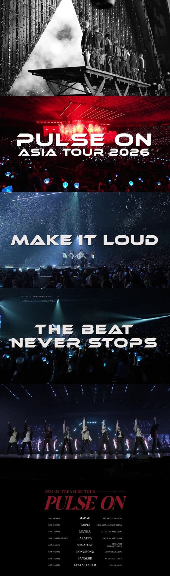 트레저는 14개 도시, 27회 차에 달하는 'TREASURE TOUR [PULSE ON]'을 전개하고 있다. 서울, 도쿄, 아이치, 후쿠오카, 카나가와 공연을 성황리에 마친 이들은 남은 일본 일정을 거쳐 마카오, 타이베이, 마닐라, 자카르타, 싱가포르, 홍콩, 방콕, 쿠알라룸푸르로 발걸음을 옮긴다.
