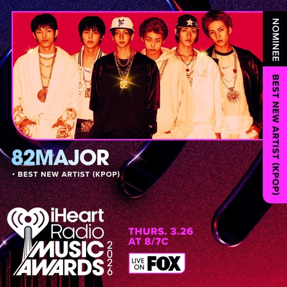 그룹 82메이저(82MAJOR, 남성모·박석준·윤예찬·조성일·황성빈·김도균)는 지난 8일(현지시각) 미국 온라인 라디오 방송사 아이하트라디오가 발표한 '2026 아이하트라디오 뮤직 어워드'(iHeartRadio Music Awards) 수상 후보 명단 중 'K팝 최고의 신인'(Best New Artist(K-Pop)) 부문에 노미네이트 됐다.