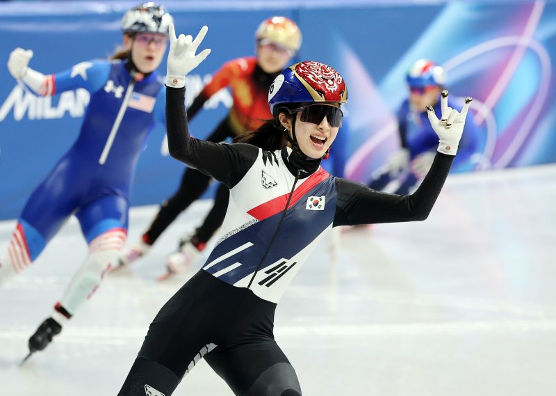 쇼트트랙 김길리가 20일(현지시간) 이탈리아 밀라노 아이스 스케이팅 아레나에서 열린 2026 밀라노·코르티나담페초 동계올림픽 쇼트트랙 여자 1500m 결승에서 금메달을 확보한 후 세레머니를 하며 환호하고 있다.뉴스1
