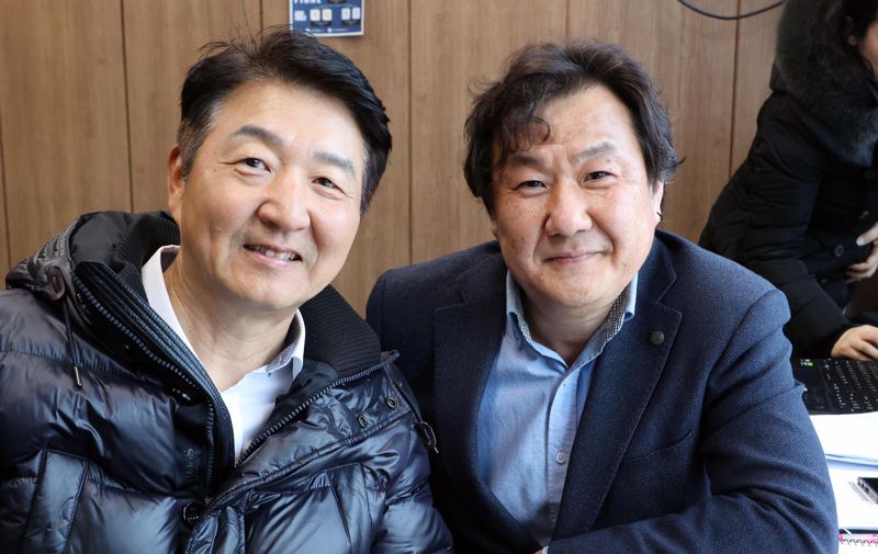 이번대회 유튜브 중계를 맡은 정민태 해설위원(왼쪽)과 김정수 캐스터(J-platfrom 대표)가 포즈를 취하고 있다.