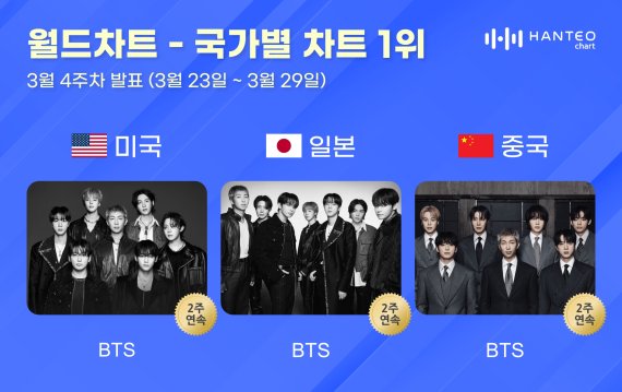 한터차트는 3일 오전, 3월 4주 차(집계 기간 3월 23일~3월 29일) 미국, 일본, 중국 국가별 차트 TOP 30을 발표했다. 이에 따르면 방탄소년단이 국가별 차트 각 부문 1위에 올랐다.