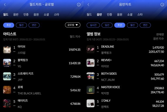 그룹 아이브(IVE)와 블랙핑크(BLACKPINK)가 한터차트를 점령했다. 세계 유일의 실시간 음악차트인 한터차트는 지난 1일 오전 10시, 2026년 2월 월간차트를 발표했다. 이에 따르면 아이브와 블랙핑크가 한터차트 2월 월간...