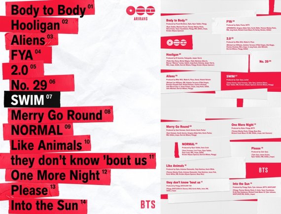 방탄소년단이 'SWIM'으로 돌아온다. 방탄소년단은 4일 팀 공식 SNS에 정규 5집 'ARIRANG'(아리랑)의 트랙리스트를 게재했다. 앨범 로고와 빨간색 테이프 형태의 그래픽이 강렬한 인상을 남긴다. 신보에는 타이틀곡 'S...