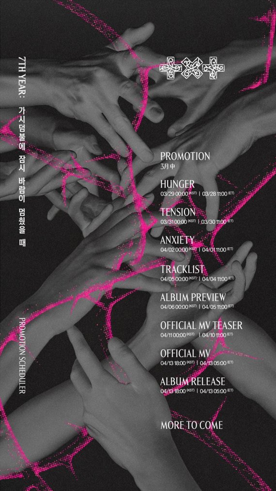 투모로우바이투게더가 다채로운 프로모션을 예고했다. 투모로우바이투게더(수빈, 연준, 범규, 태현, 휴닝카이)는 5일 0시 팀 공식 SNS에 미니 8집 '7TH YEAR: 가시덤불에 잠시 바람이 멈췄을 때' 프로모션 스케줄러를 공개했...