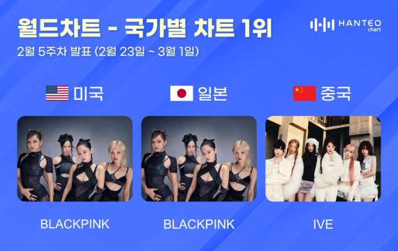 블랙핑크와 아이브가 한터 국가별 차트 정상을 차지했다. 세계 유일의 실시간 음악차트인 한터차트는 6일 오전, 2월 5주 차(집계 기간 2월 23일~3월 1일) 미국, 일본, 중국 국가별 차트 TOP 30을 발표했다. 이에 따르면...